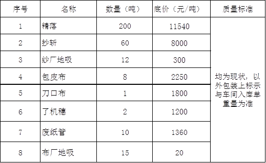 ? ? ? ? 经报上级有关部分批准 ,非凡国际恒盛纺织分公司(以下简称“我公司”)将于2021年7月12日至7月20日对下脚举行拍卖。有意竞拍者请于2021年7月12日至2021年7月19日到我公司审查所拍卖的下脚 ,打点交付竞价包管金、确认竞拍资格、提交标书等手续。现将相关事宜通告如下: